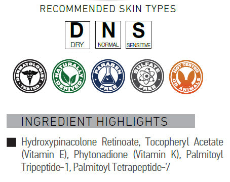 A rich and restorative, all-in-one, anti-aging eye cream contains peptide complexes, a breakthrough Retinoid, and a form of Vitamin K, to reduce dark circles, promote collagen production to improve fine lines and wrinkles, and increase cellular turnover resulting in healthy, younger-looking skin in this delicate area.