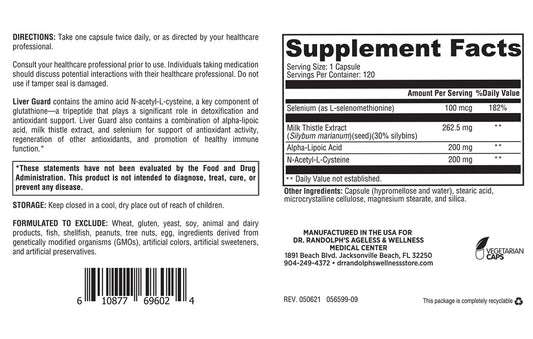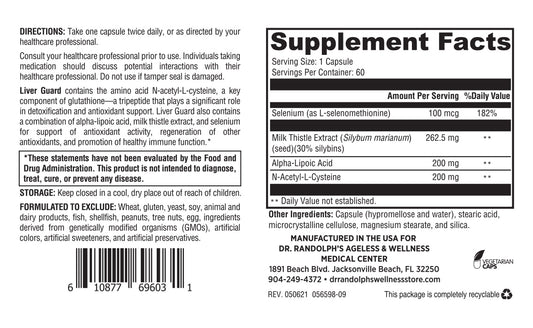 Liver Guard also contains a combination of alpha-lipoic acid, silymarin from milk thistle, and selenium for support of antioxidant activity, regeneration of other antioxidants, and promotion of healthy immune function.