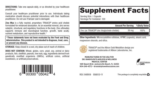 Zinc Max is a fully reacted, proprietary TRAACS® amino acid chelate formulated for enhanced absorption. As an essential mineral, zinc serves catalytic, structural, and regulatory functions in the body.