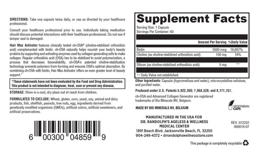 Hair Max Activator provides ch-OSA® (choline-stabilized orthosilicic acid), that helps naturally nourish your body’s beauty proteins. Regular orthosilicic acid is highly unstable, leading it to form polymers.
